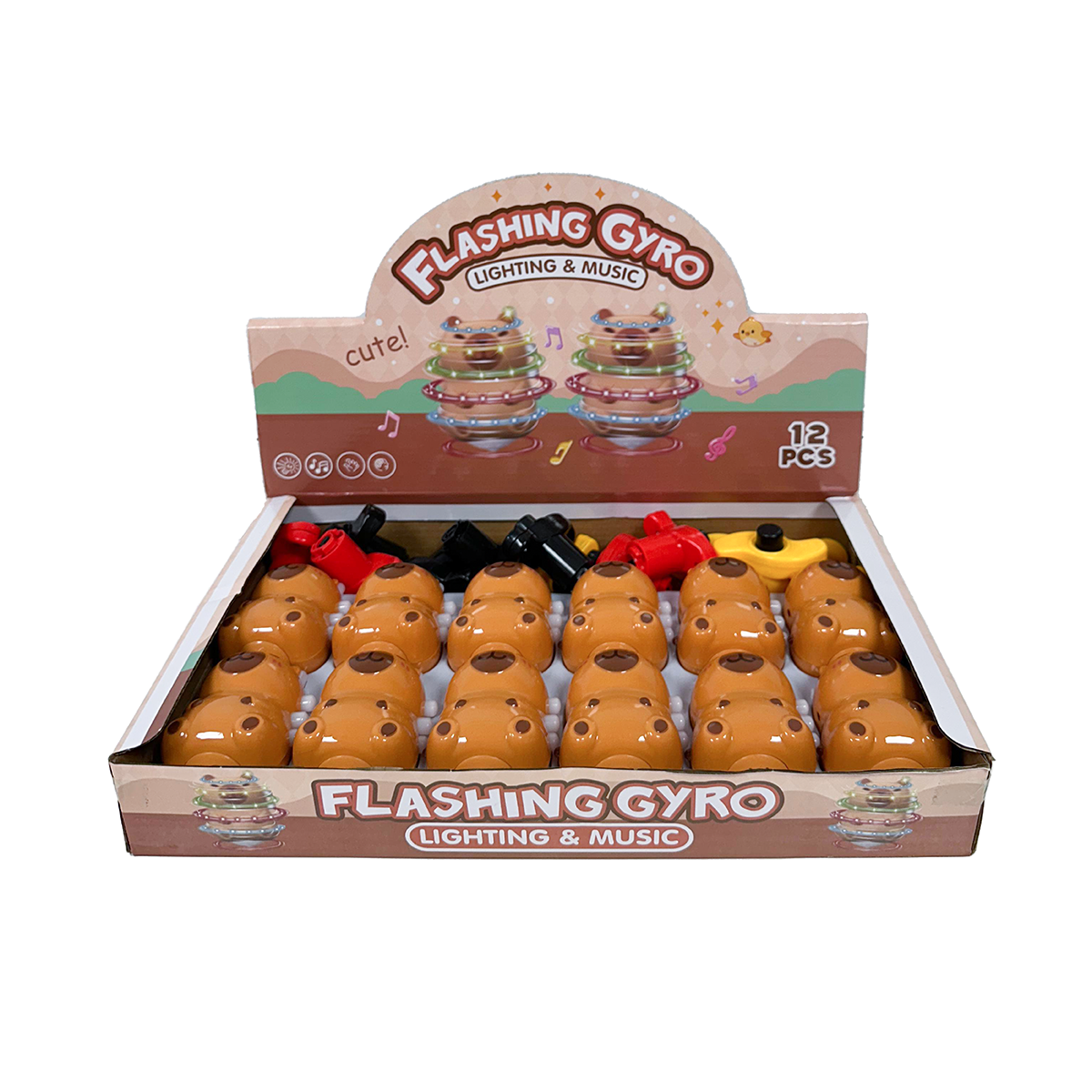 ¡Dale un giro de diversión a cada momento! Hacelo girar mientras te divertís con sus luces brillantes y melodías infantiles, ¡Ideal para horas de entretenmiento! Disponible en un display de 12 unidades.