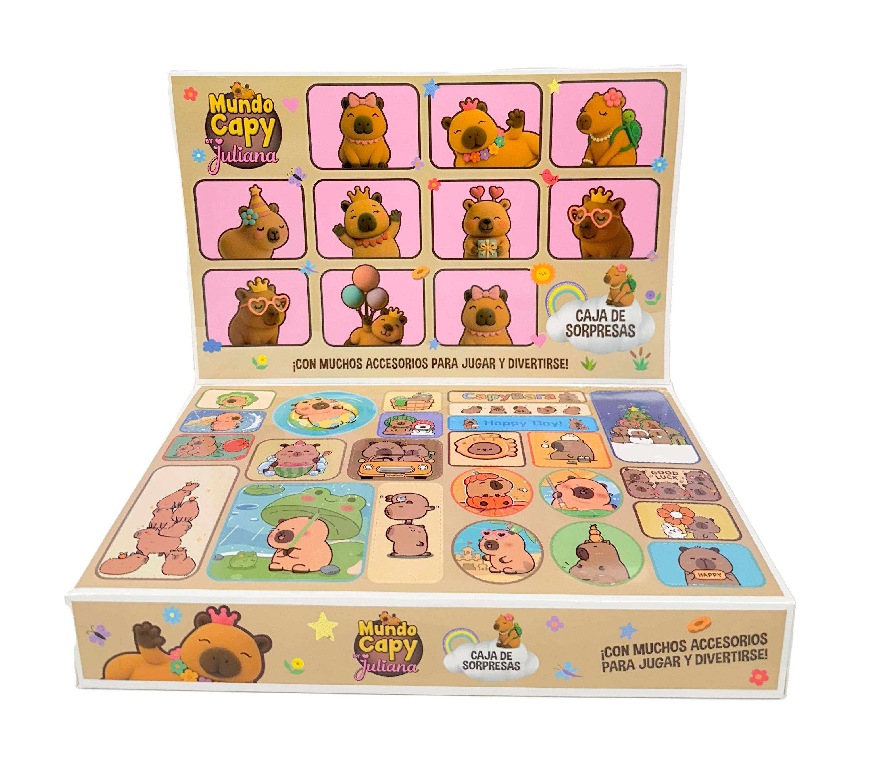 Una caja, muchas sorpresas. Dejate sorprender con esta caja llena de accesorios para jugar y divertirse. Y a vos ¿Qué te va a tocar? Descubrí y entrá en el mundo de capibaras con la caja de sorpresas.