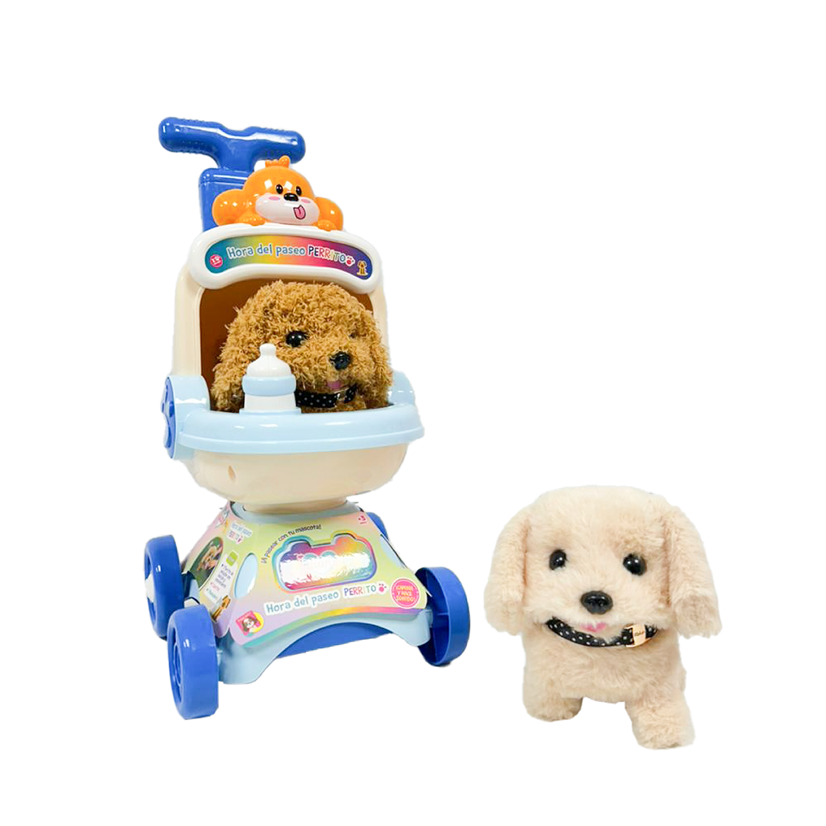 1 mascota de peluche con sonido y movimiento, 1 carrito, 1 mamadera.