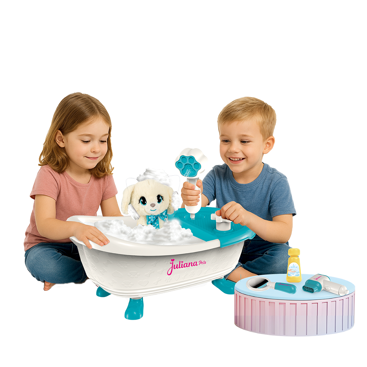 Hora del baño con tus mascotas más tiernas. Con este set podés bañar, peinar, cuidar y mimar a tu mascota mientras jugás. La bañera incluye su mascotita y un duchador que sale agua de verdad, para que los peques puedan mojarla, enjuagarla y dejarla secar. Diversión y cuidado en un solo juego.