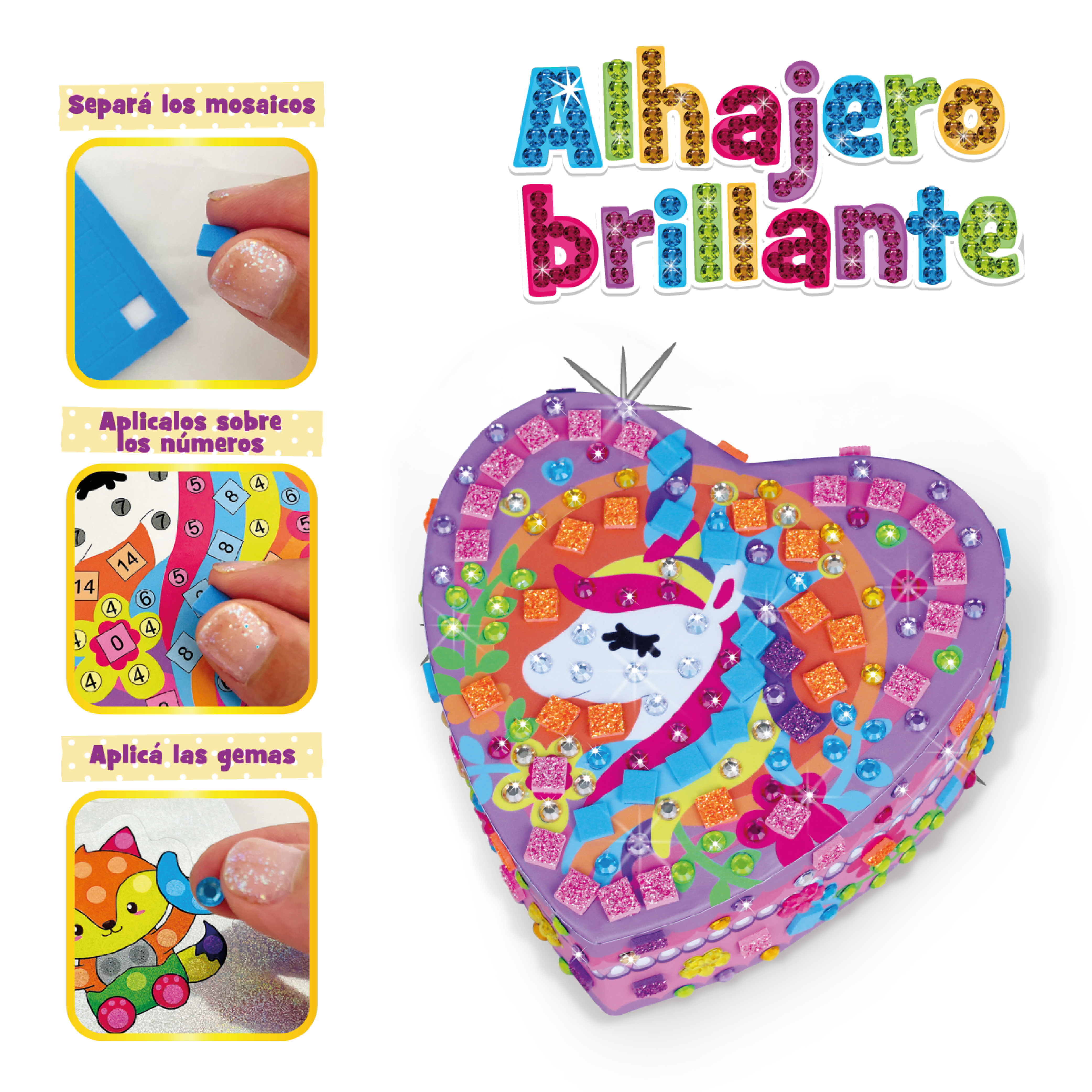 Decorá tu alhajero con los mosaicos y gemas brillantes! Seguí el patrón numérico que te indica dónde va cada una. Tambien tenes stickers para decorar!